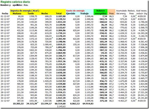 Posteriormente, construí la hoja de cálculo para realizar el Seguimiento de mi Dieta diaria / mensual / anual ... El Balance Energético. En ella incluí el Indice de Masa Corporal - IMC - y El Gasto energético del ejercicio que realizaba - mis caminatas -. Al final obtenía diariamente mi Balance Energético, es decir la diferencia entre las Calorías Ingeridas y las Consumidas.